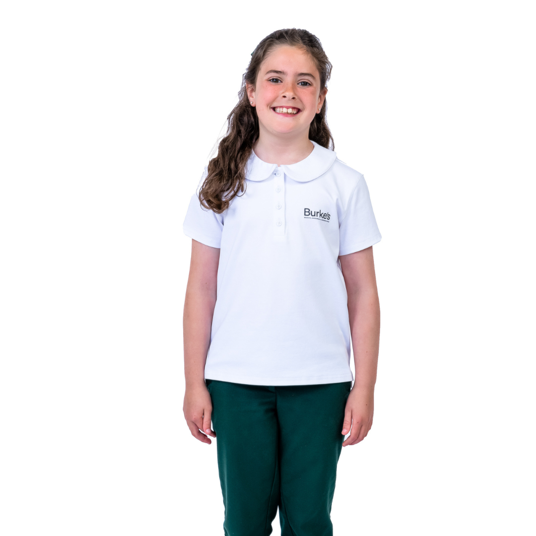 Classic comfort meets uniform style in this 100% cotton polo with a distinctive rounded Peter Pan collar. A uniform essential, this soft, naturally breathable shirt also features the Burke's logo.