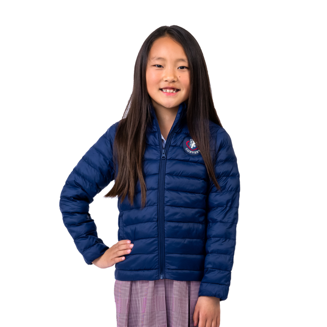 Warmth without weight—this school puffer jacket delivers cozy comfort for chilly morning drop-offs and outdoor recess. Its unique fold-away design lets students pack the jacket completely into its own interior pocket, zipping closed the compact bundle before tossing it into a backpack. Branded with the school’s logo.