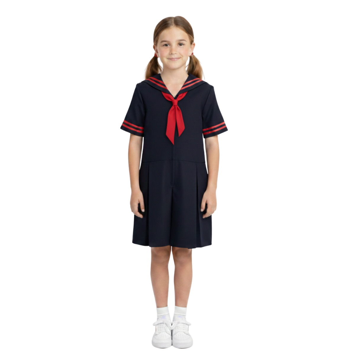This traditional sailor dress combines classic styling with modern performance. The updated fabric delivers comfort and flexibility while honoring the timeless design. A front zipper ensures easy dressing and undressing, while practical pockets add functionality.